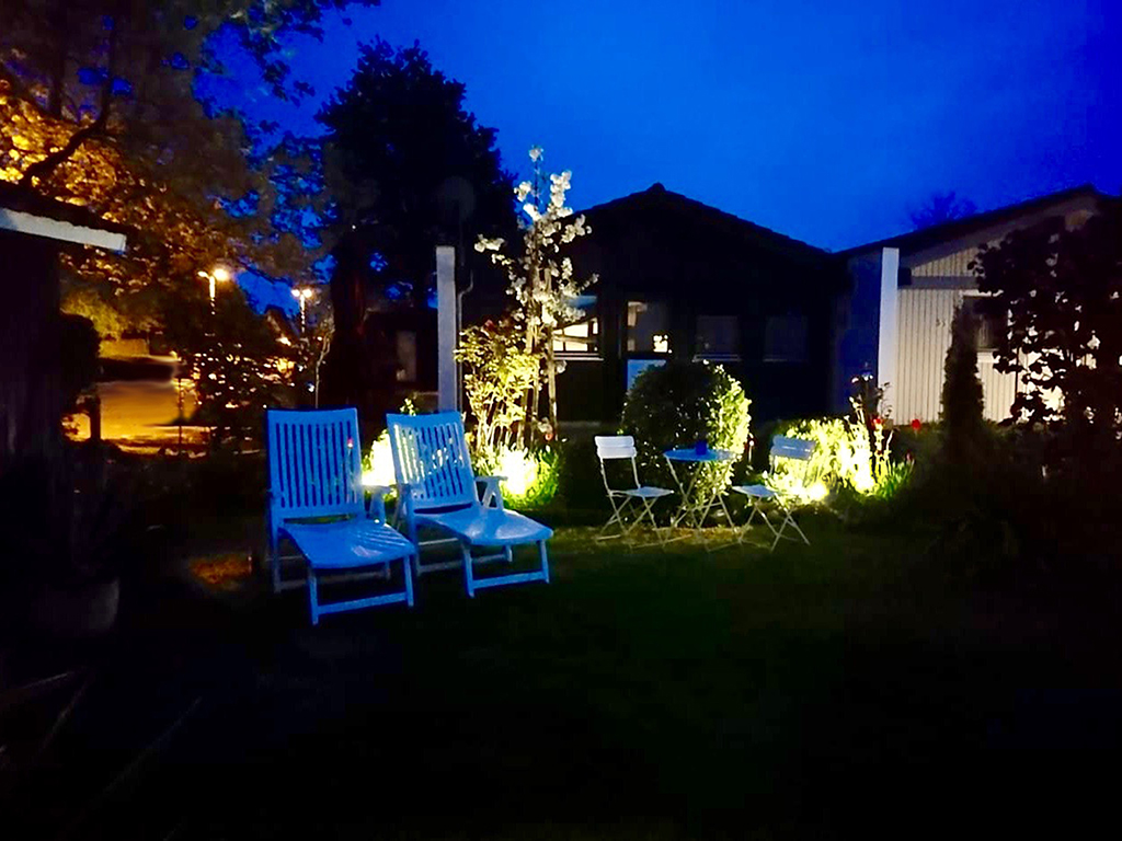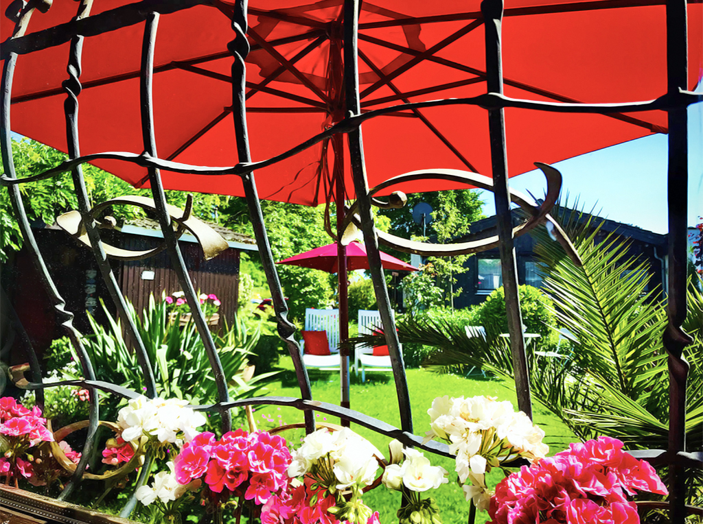 Ausblick auf den gepflegten mit Blumen umsäumten Garten.